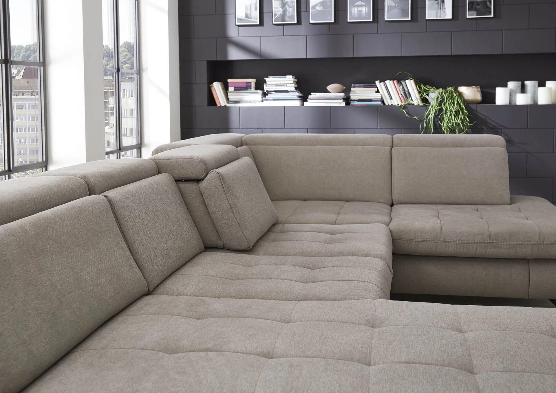 Moderne Optik zum Loungen Unglaublich viel Platz – die moderne Wohnlandschaft sorgt für größtmögliche Gemütlichkeit. Lounge-Charakter gemütliche Sitze inkl. Sitztiefenverstellung erstklassige Kaltschaumpolsterung super Verarbeitung Als super bequeme Sitzgelegenheit lädt die große Wohnlandschaft zur genussvollen Auszeit. Hier haben Sie ausreichend Platz um zu Entspannen und Relaxen. Langelegen – kein Problem. Mit tiefen Sitzen lädt die Polsterecke zum Träumen. Variabel auch Ihre Sitzposition. Wann immer Sie möchten, kann die Sitztiefe Ihren Bedürfnissen angepasst werden. Durch leichtes Anheben und Vorziehen des Rückens lässt sich die Sitztiefe problemlos gestalten. Die moderne Optik zum Loungen überzeugt mit softem Sitzkomfort. Hochwertiger Kaltschaum, hervorragend verarbeitet, garantiert angenehmen und weichen Sitzgenuss. Zusatzoptionen wie verstellbare Kopfpolster oder klappbare Armlehnen sorgen für zusätzlich KomfortSchwarze Metallfüße geben Halt und betonen die moderne Lounge-Optik.Abmessungen Breite: 387 cm Tiefe: 220 cm Höhe: 84 cm Länge Element links: 127 cm Länge Element Mitte: 134 cm Länge Element rechts: 126 cm Belastbarkeit (pro Sitz): 120 kg Sitzhöhe: 47 cm Sitztiefe: 79 cm Hauptfarbe/-material Farbe: Granit Material: Chenilleflachgewebe Füße/Beine/Gestell Farbe Füße, Beine, Gestell: Alufarben Material Füße, Beine, Gestell: Metall Oberflächeverarbeitung Füße, Beine, Gestell: glänzend Polsterung Sitz: Kaltschaum Stahlwellenfedern Rückenlehne: Gummigurte Schaumstoff Material Untergestell: Holz Bezug Textilkennzeichnung: 95% Polyester, 5% Nylon Merkmale Anzahl Sitzplätze: 5 Rücken bezogen Funktion Funktionen und Bedienung: Sitztiefe verstellbar (manuell) Hinweise Zertifizierung: Goldenes M RAL Gütezeichen Hinweise: Abweichungen in Farbe, Form, Abmessungen gegenüber den Abbildungen und Angaben vorbehalten Legere Verarbeitung/Polsterung – Faltenbildung gewollt Pflegehinweise: Bitte die Pflegehinweise der Hersteller beachten.