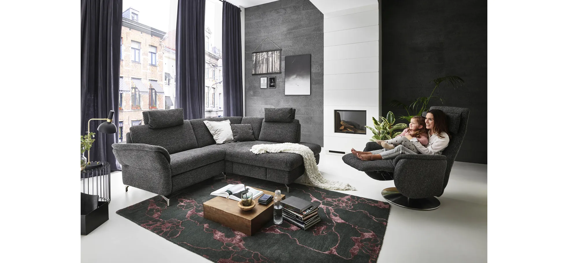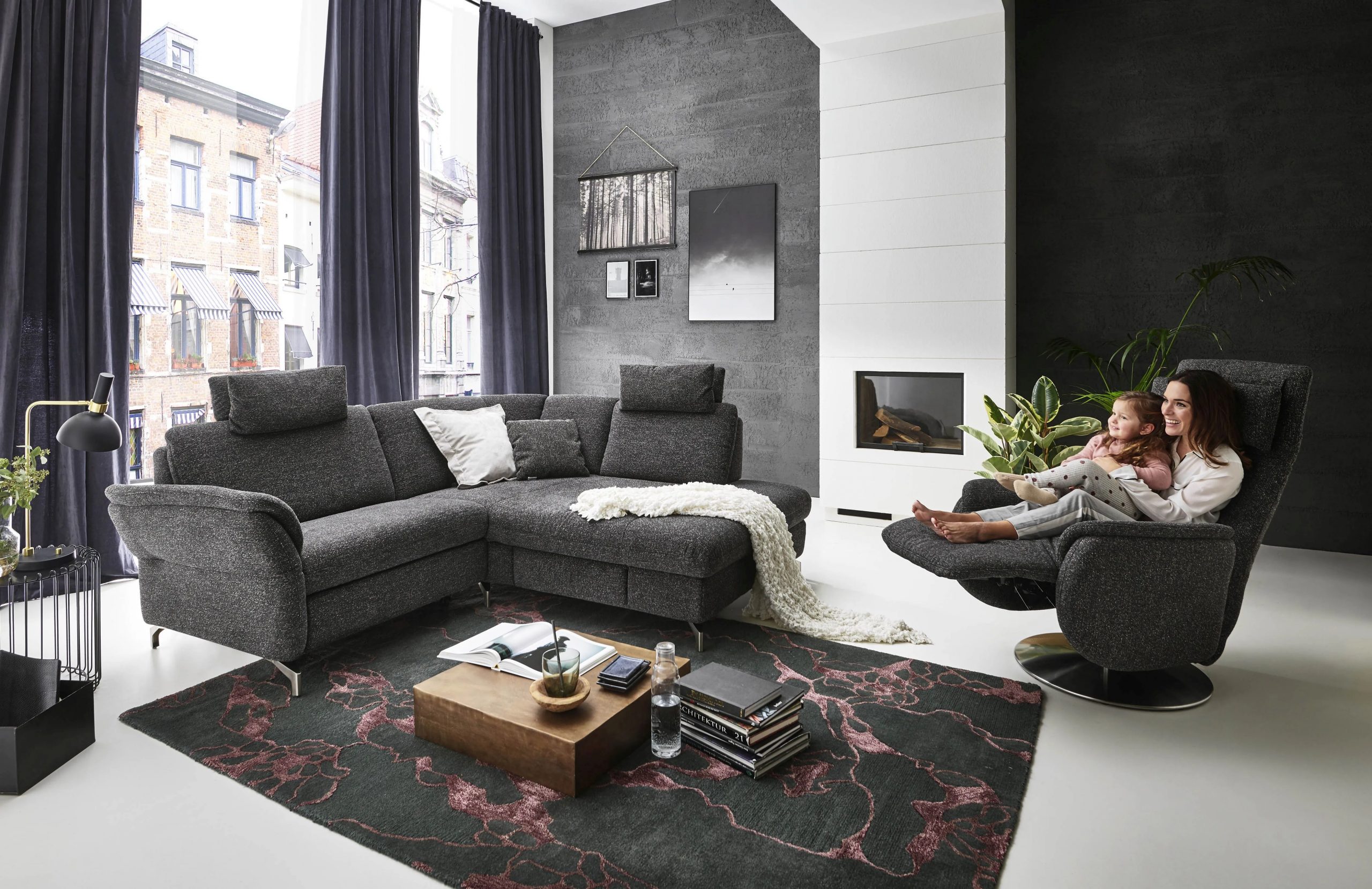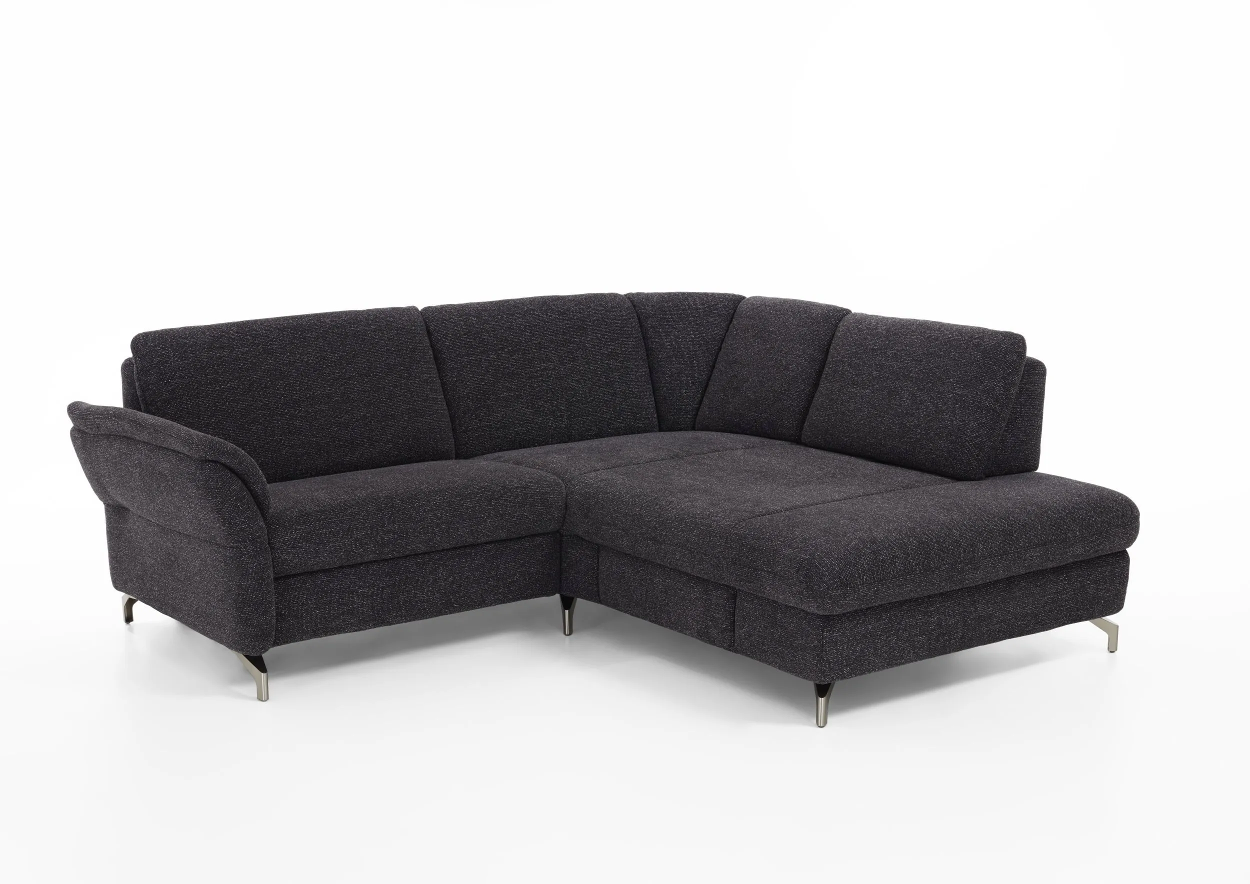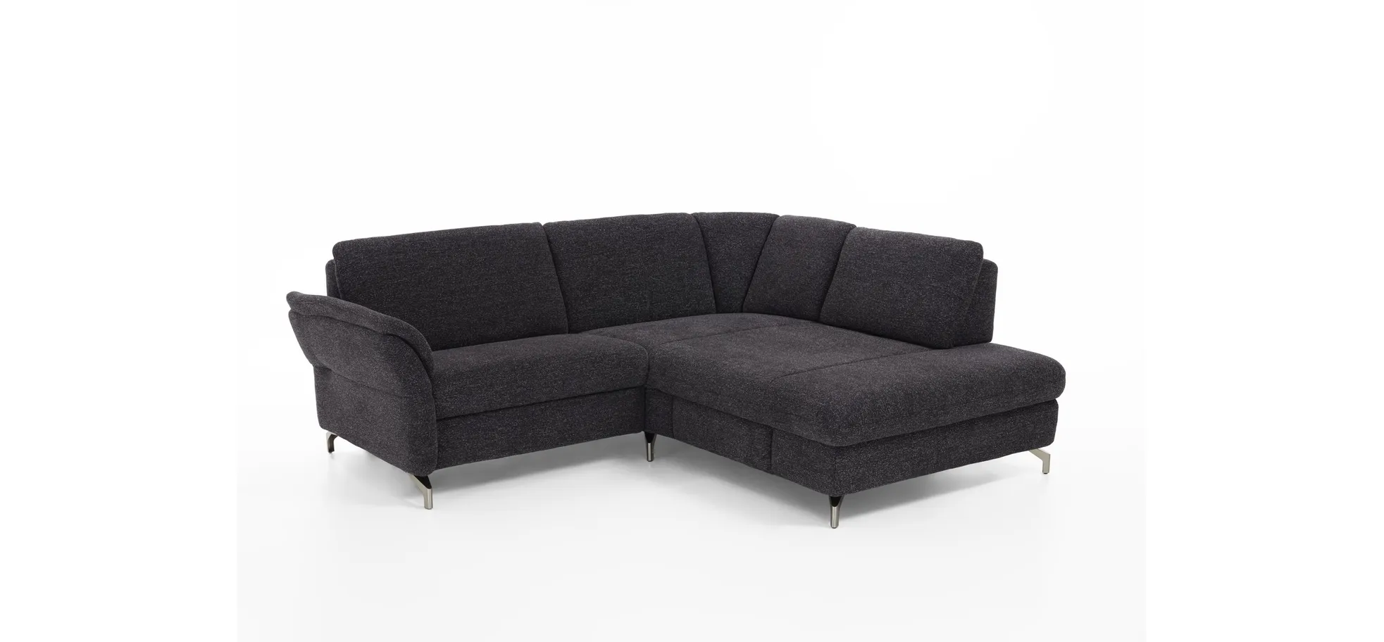 Großer Komfort auf kleinem Raum Gemütlichkeit auf kompakter Fläche – das Sofa zum Wohlfühlen. ? frei im Raum platzierbar ? bodenfrei ? kompakte Stellflächen Reichlich Platz zum Wohlfühlen und sich mal lang ausstrecken bietet Ihnen die moderne, kompakte Polstergarnitur. Kleine Stellfläche – aber groß im Komfort. Ein bequemer PUR-Schaum sorgt für anschmiegsamen Sitzgenuss und fantastischen Wohlfühlkomfort. Optionale Kopfstützen sorgen für super Entspannung von Kopf- und Nackenbereich. Mit einer zusätzlichen motorischen TV-Relax-Funktion schaffen Sie sich Ihre kleine, ganz private Wohlfühloase. Ob an der Wand oder mittig im Raum, gestalterisch sind Ihrer Kreativität mit dieser Polsterecke keine Grenzen gesetzt.Abmessungen Breite: 222 cm Tiefe: 193 cm Höhe: 85 cm Belastbarkeit (pro Sitz): 120 kg Sitzhöhe: 46 cm Sitztiefe: 53 cm Hauptfarbe/-material Farbe: Graphit Material: Chenilleflachgewebe Füße/Beine/Gestell Form Füße, Beine, Gestell: Winkelfuß Farbe Füße, Beine, Gestell: Nickel Oberflächeverarbeitung Füße, Beine, Gestell: satiniert Polsterung Sitz: Diolenwattenabdeckung Schaumstoff Stahlwellenfedern Rückenlehne: Diolenwattenabdeckung Gummigurte Schaumstoff Details: PUR-Schaum Material Details Untergestell: Holzrahmen, Holzwerkstoffe verleimt, verdübelt Bezug Textilkennzeichnung: 100% Polyester Scheuertouren Bezug: 38000 Lichtechtheit Bezug: 5 Merkmale Rücken bezogen Funktion Funktionen und Bedienung: Sitztiefe verstellbar (manuell) Funktionen und Bedienung Details: Sitztiefenverstellung in der Ecke: 57cm normal Sitztiefe verstellt: 82 cm Hinweise Hinweise: Abweichungen in Farbe, Form, Abmessungen gegenüber den Abbildungen und Angaben vorbehalten Legere Verarbeitung/Polsterung – Faltenbildung gewollt Pflegehinweise: Bitte die Pflegehinweise der Hersteller beachten.
